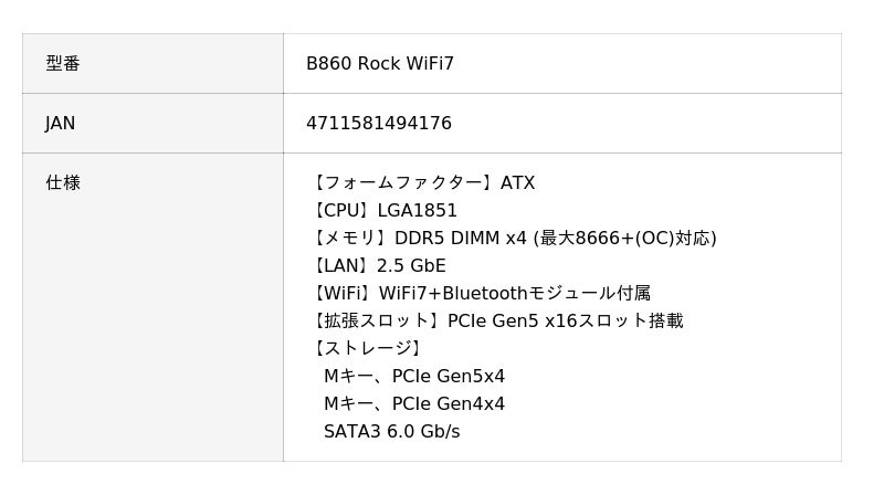 B860 Rock WiFi7 | ASRock(アスロック) LGA1851 Intel B860 ATX WiFi+Bluetoothモジュール付属 マザーボード