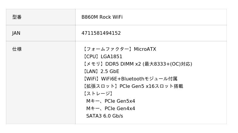 B860M Rock WiFi | ASRock(アスロック) LGA1851 Intel B860 MicroATX WiFi+Bluetoothモジュール付属 マザーボード