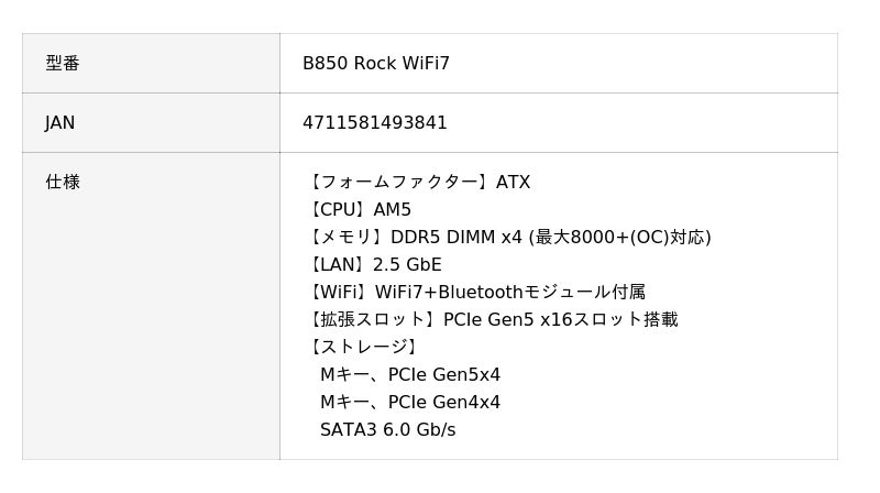 B850 Rock WiFi7 | ASRock(アスロック) Socket AM5 AMD B850 ATX WiFi+Bluetoothモジュール付属 マザーボード