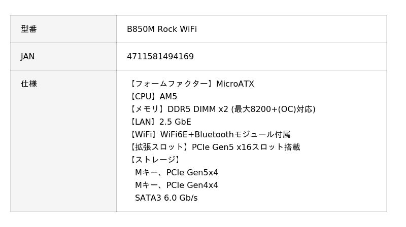 B850M Rock WiFi | ASRock(アスロック) Socket AM5 AMD B850 MicroATX WiFi+Bluetoothモジュール付属 マザーボード