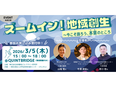「ズームイン!地域創生 ~今こそ語ろう、本音のところ」を3/5(木)にQUINTBRIDGE(大阪府大阪市)で開催いたします。