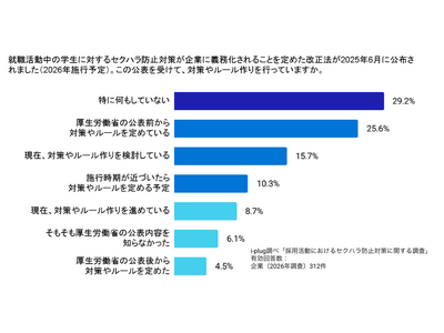 就職活動中の学生に対するセクハラ防止対策が企業に義務化されることに対し、現在の対応状況を伺いました。「特に何もしていない」が最多の29.2%でした。 一方で、「厚生労働省の公表前から対策やルールを定めている(25.6%)」と「公表後から定めた(4.5%)」を合わせると約3割の企業がすでに対策を講じているようです。 また、「現在、対策やルール作りを進めている(8.7%)」企業に加え、「検討している(15.7%)」企業も一定数おり、対応状況にばらつきが見られます。