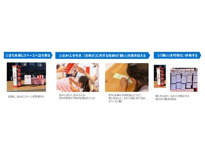 未来のまちに起こりうることをおみくじで知り、それに対する自身の考えを「願い」として書き換える体験を通じて、「まちの未来は決まっているものではなく、自分たちでつくるもの」という市民の意識醸成を促します。制度的なパブリックコメントではなく、誰もが親しみやすいおみくじを活用しながら、多様な人々が集まる民間の商業施設をフィールドとすることで市民の参加のハードルを下げ、より多くの意見やアイデアを引き出して可視化・共有することがねらいです。