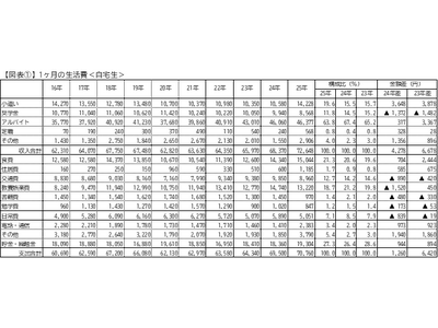 支出構造では、食費が増加する一方、交通費・教養娯楽費の抑制、学習関連支出(書籍・勉学費)の低下がみられた。とくに書籍費は2016年以降はじめて1,000円を下回った。