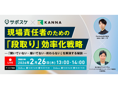 株式会社アルダグラム(本社:東京都港区、代表取締役:長濱光、以下「アルダグラム」)が提供する現場DXサービス「KANNA(カンナ)」は、Paintnote株式会社(本社:品川区、代表者:藤井友輝、以下「Paintnote」)と共催で、2026年2月26日(木)に現場管理にお悩みを抱える現場担当者・責任者の方を対象とした「現場責任者のための「段取り」効率化戦略」をテーマとしたオンラインセミナーを開催します。本セミナーでは、なぜツールを導入しても課題がなくならないのか、その"本当のボトルネック"を、両社の視点から構造的に解説します。