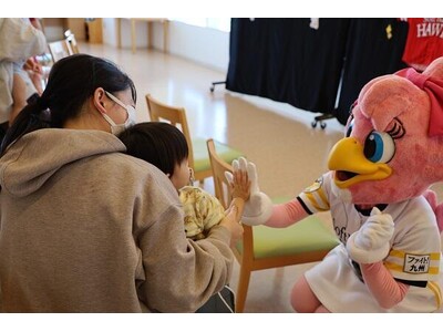 福岡大学病院と福岡大学筑紫病院の小児病棟に、福岡ソフトバンクホークスの公式キャラクターであるハリーとハニーが訪れ、入院中の子どもたちと交流しました。