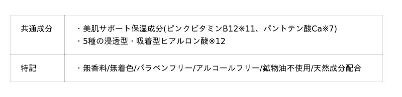※11:シアノコバラミン/整肌成分 ※12:加水分解ヒアルロン酸、加水分解ヒアルロン酸Na、ヒアルロン酸Na、ヒアルロン酸ジメチルシラノール、ヒアルロン酸ヒドロキシプロピルトリモニウム/保湿成分