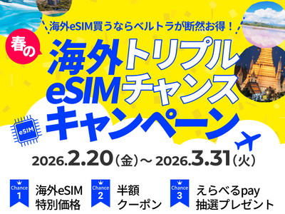 現地体験型オプショナルツアー専門予約サイト『ベルトラ』を運営するベルトラ株式会社(本社:東京都中央区、代表取締役社長:二木 渉)は、春休みやゴールデンウィークに海外旅行を計画されている方を対象に、海外用eSIMが特別価格で購入できるほか、豪華特典も当たる「春の海外旅行eSIMトリプルチャンスキャンペーン」を開始いたしました。
