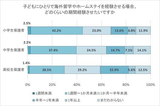 留学やホームステイの期間については、小学生保護者・中学生保護者は「1週間~1か月未満」が最も多かった。高校生保護者は「1週間~1か月未満」と「1か月~半年未満」と回答した割合が同程度だった。