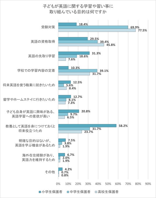中学生保護者・高校生保護者で最も割合が高かったのは「受験対策」で、中学生保護者の69.9%、高校生保護者の77.5%にのぼった。小学生保護者では「教養として英語を身につけておくと将来役立つため」が58.2%と最も高い割合だった。また、「英語の資格取得」は、中学生保護者・高校生保護者いずれも、回答した割合が2番目に高かった。小学生保護者では「英語の先取り学習」が2番目に高かった。