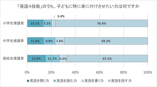 小学1年生~高校3年生の保護者に、英語4技能(聞く・読む・書く・話す)のうち、特に子どもに身につけさせたい力を聞いた。小学生保護者・中学生保護者・高校生保護者のいずれも「英語を話す力」が最も多く、小学生保護者76.4%、中学生保護者69.2%、高校生保護者67.1%となった。