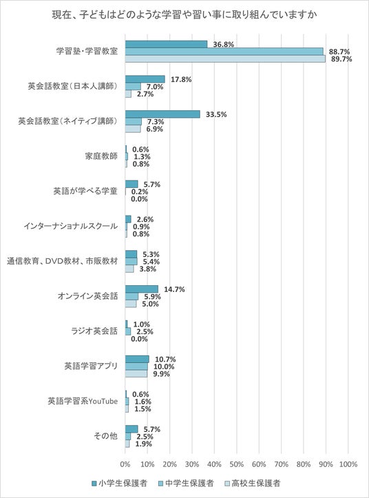 小学生保護者・中学生保護者・高校生保護者のいずれも、最も割合が高かったのは「学習塾・学習教室」で、特に中学生保護者・高校生保護者は約9割にのぼった。小学生保護者では、「学習塾・学習教室」に次いで、「英会話教室(ネイティブ講師)」も3割以上だった。