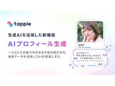 株式会社タップル(本社:東京都渋谷区、代表取締役社長:平松繁和)は運営するマッチングアプリ「タップル」において、マッチング率やメッセージ返信率などの利用実績に基づく独自データを活用し、生成AIが利用者一人ひとりの魅力を最大限に引き出す自己紹介文を提案する新機能「AIプロフィール生成」を提供開始いたしました。