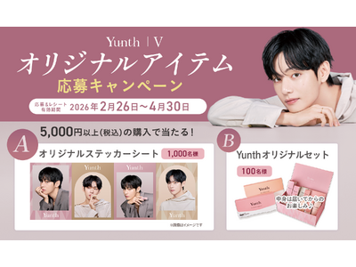 Aiロボティクス株式会社(本社:東京都港区、代表取締役社長:龍川 誠)が展開するスキンケアブランドYunth(ユンス)は、2026年2月26日(木)~4月30日(木)の期間限定で、オリジナルステッカーシートなどが当たるマストバイ企画として、「Yunth │ V オリジナルアイテムが当たる!レシート応募キャンペーン」を開催します。