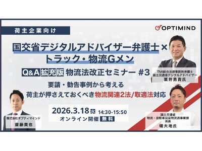 株式会社オプティマインド(本社:名古屋市、代表取締役:松下 健)は、2026年3月18日(水)14:30より、国土交通省デジタルアドバイザー弁護士が登壇する物流法改正セミナーシリーズ第3回をオンラインで開催します。