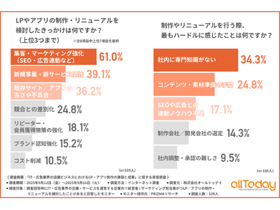攻めのWeb戦略を阻む「ノウハウ不足」。成功のカギを握る、内製と外注の使い分けポイントとは株式会社オールトゥデイ(本社所在地:埼玉県さいたま市)は、IT・広告業界の店舗・サービスを運営する企業の1.経営者2.マーケティング担当者かつLP/アプリの制作・リニューアルを検討したことがある方を対象に、「IT・広告業界の店舗ビジネスにおけるLP・アプリ制作の課題と成果」に関する実態調査を実施しましたので、その結果を公表します。調査概要調査概要:「IT・広告業界の店舗ビジネスにおけるLP・アプリ制作の課題と成果」に関する実態調査【調査期間】2025年9月12日(金)~2025年9月16日(火)【調査方法】PRIZMA(https://www.prizma-link.com/press)によるインターネット調査【調査人数】105人【調査対象】調査回答時にIT・広告業界の店舗・サービスを運営する企業の1.経営者2.マーケティング担当者かつLP/アプリの制作・リニューアルを検討したことがあると回答したモニター【調査元】株式会社オールトゥデイ(https://www.alltoday.jp/)【モニター提供元】PRIZMAリサーチ※本アンケート結果を引用する場合は「株式会社オールトゥデイ」のURL(https://www.alltoday.jp/)を使用してください。調査結果サマリー「LPやアプリの制作・リニューアルを検討したきっかけ」について尋ねたところ、『集客・マーケティング強化(SEO・広告連動など)(61.0%)』と回答した方が最も多く、『新規事業・新サービス開始(39.1%)』『既存サイト/アプリの古さや不具合(36.2%)』となりました。約6割の企業が『集客・マーケティング強化(SEO・広告連動など)』を挙げており、制作物が売上に直結する「営業ツール」として期待されている様子がうかがえます。また、2位は「新規事業」、3位は「既存サイトの古さ・不具合」となりました。この結果から、攻めの姿勢でビジネス拡大を狙う層と、システムの老朽化という守りの課題に直面している層の双方が混在していると考えられます。そのような中、実際の制作現場ではどのような壁に直面したのでしょうか。「制作やリニューアルを行う際、最もハードルに感じたこと」について尋ねたところ、『コンテンツ・素材準備の手間(34.3%)』と回答した方が最も多く、『SEOや広告との連動ノウハウ不足(24.8%)』『社内に専門知識がない(17.1%)』となりました。制作やリニューアル時のハードルとして最多になったのは、開発やデザインといった技術的な工程そのものではなく、その前段階である「コンテンツや素材の準備」でした。IT・広告業界の企業であっても、魅力的な原稿作成や写真・動画の手配といった「中身」の用意にリソースやノウハウが不足し、プロジェクトが停滞しやすい現状がうかがえます。また、『SEOや広告との連動ノウハウ不足』や『社内に専門知識がない』も上位になり、LPやアプリを作るだけでなく、「どう見せるか」「どう集客するか」という運用視点での設計に苦慮している様子も見られます。では、そのような課題に対し、企業はどのような体制で解決を図ろうとしているのでしょうか。「LP/アプリ制作は外注・内製どちらを選ぶ予定か」と尋ねたところ、以下のような回答結果になりました。『完全外注(31.4%)』『部分外注(54.3%)』『完全内製(14.3%)』半数以上の企業が『部分外注』を選択しており、すべてプロにお願いする『完全外注』は約3割にとどまりました。これは、自社の強みやこだわりを反映させたい部分は社内で担当しつつ、課題となっていた「素材準備」や「専門ノウハウ」が必要な領域をプロに任せるという、合理的な判断の結果と考えられます。IT・広告業界といえど、すべてのリソースを社内で賄うのではなく、外部パートナーの知見を柔軟に取り入れながら、クオリティとコストのバランスを最適化しようとする姿勢が読み取れます。【まとめ】今回の調査で、IT・広告業界の店舗ビジネスにおいて、LP/アプリ制作は「集客・マーケティング強化」を目的とした攻めの投資である一方、「コンテンツ準備」や「SEOや広告との連動ノウハウ不足」が障壁となっている実態が浮き彫りになりました。一方、制作体制においては「完全外注」と回答した方は約3割にとどまり、「部分外注」が過半数を占めました。これは、社内リソースの限界を認識し、不足している専門性や労力を外部パートナーで補うことで、プロジェクトを円滑に進めようとする現実的な解釈といえます。変化の激しいデジタル市場で成果を出し続けるためには、自社のコア業務に集中しつつ、制作やマーケティング設計においては柔軟に外部の力を借りる「共創」のスタンスが、今後ますます重要になってくると考えられます。株式会社オールトゥデイ株式会社オールトゥデイ(https://www.alltoday.jp/)は、携帯端末を利用した効果的なプロモーションを実現する総合ソリューションサービスをご提供しております。顧客管理やアフターフォロー、クチコミで来店のきっかけづくりをお手伝いします。お店にご来店いただいたお客様に、