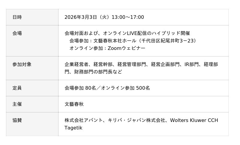 アバントは、2026年3月3日に開催される株式会社文藝春秋(本社:東京都千代田区、代表取締役:飯窪 成幸、以下 文藝春秋)主催「文藝春秋カンファレンス ROIC経営第7弾 「続けるか、手放すか」意思決定の新機軸 ― ROICで見極める成長領域 ―」にて講演いたします。