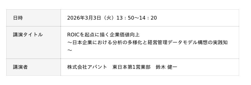 アバントは、お客様の企業価値向上につながるROIC経営のご支援を推進しており、ROIC経営に取り組まれている経営者や企画・管理部門の方々へ向け「分析の多様化と経営管理データモデル構想」をテーマに講演を行います。