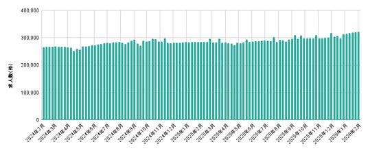 ■2月度の全国正社員求人数は322,774件(前月比+8,134件、前年同月比+37,315件)で前月から2.59%増加、前年同月から13.07%増加した。【図2】
