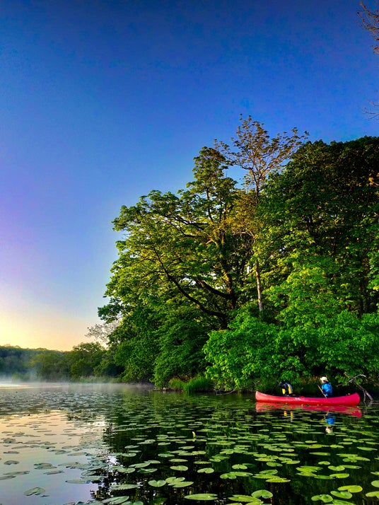 ポロト湖の雄大な風景にカヌーという体験が加わることで、見る人を白老の自然の中へと誘うような物語性が生まれているように感じます。鮮やかな緑と赤いカヌーの対比も鮮烈です。