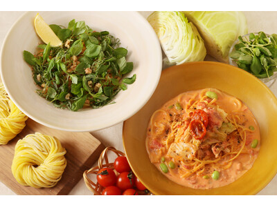 旬の味わいを楽しむ、春の和パスタ2種が登場。やわらかな甘みの春キャベツを使った「春キャベツとコンポークのトマトクリームパスタ」と、香り豊かな大葉をたっぷり使った定番人気の「明太バターと大葉畑パスタ」。和のやさしさと春の恵みを感じる、この時期ならではの味わいをぜひお楽しみください。