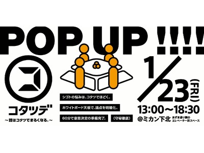 令和8年1月23日(金)、継続するための外部クリエイティブチーム「ING」が、下北沢の道端に「コタツ会議室」を出現させました。INGメンバー3名と、飛び入りを含む計6名の相談者がコタツを囲み、極寒の屋外であることを忘れるほどの熱気に満ちた集中空間を創出。ホワイトボード化した天板には次々と文字が書き込まれ、言葉と視覚情報が交差する、不思議でいて濃密な対話の場となりました。