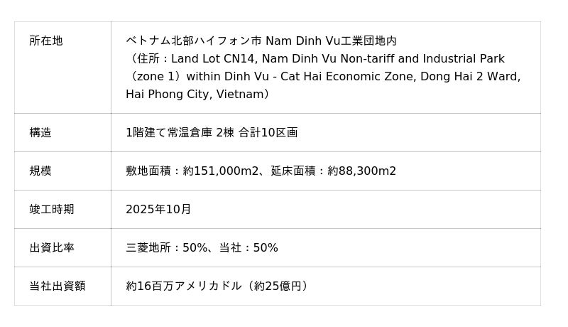 株式会社商船三井(社長:橋本 剛、本社:東京都港区、以下「当社」)は、三菱地所株式会社(代表執行役 執行役社長:中島 篤、本社:東京都千代田区)がベトナム北部ハイフォン市において推進する賃貸倉庫開発事業「Logicross Hai Phong」(以下、「本物件」)に出資参画しました。ベトナムで賃貸倉庫を保有するのは当社初であり、東南アジア地域でのロジスティクス事業展開をさらに加速させます。