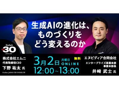 2026年3月2日(月)、株式会社エムニ(本社:東京都千代田区、代表取締役CEO:下野祐太、以下「エムニ」)は、エヌビディア合同会社(以下「NVIDIA」)より井崎 武士 様をお招きし、生成AIの最新動向と製造業AIの次の5年を解説する無料オンラインセミナーを開催することが決定いたしました。