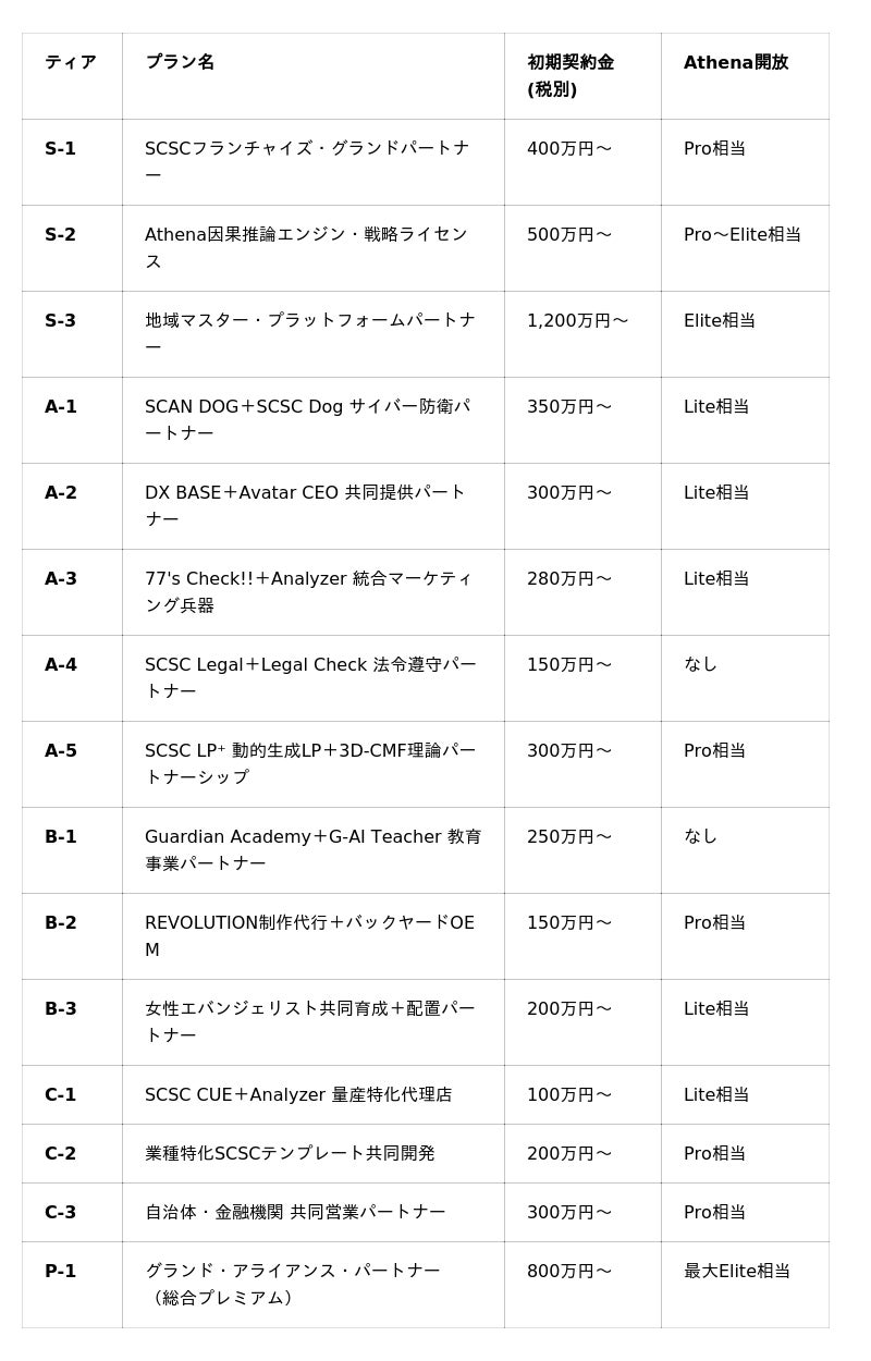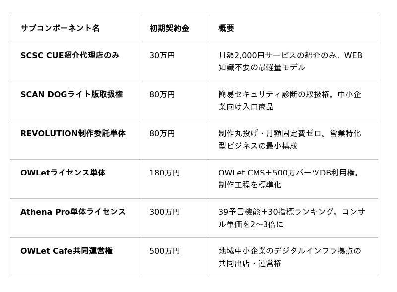 パートナー候補企業の参入障壁を最小化するため、全15プランの構成要素を21のサブコンポーネントとして個別契約可能にしました。最低初期30万円(SCSC CUE紹介代理店)から、最大500万円(OWLet Cafe共同運営権)まで、業種と目的に合った「最初の一歩」を選択できます。