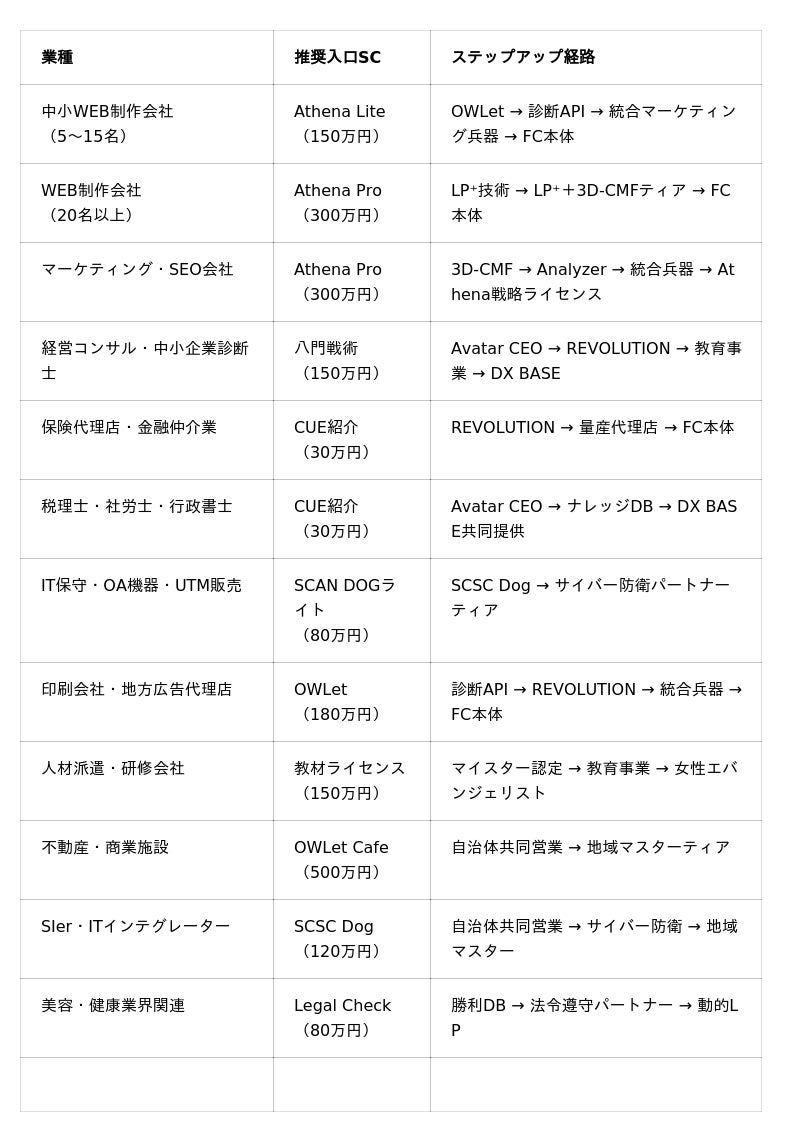 当社は、21のサブコンポーネントそれぞれについて「最もROIが高く」「営業アプローチが容易で」「ステップアップの可能性が大きい」最適3業種を特定した業種マッピングを策定済みです。営業部隊は、見込みパートナーの業種を聞いた瞬間に最適な提案を即座に行えます。