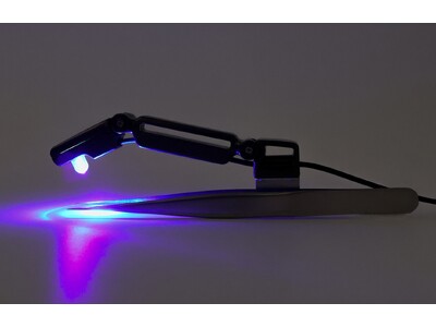 本製品では、紫外線(UV)ではなく、可視光線に分類されるLED 405nmを採用しています。この波長は人体に影響がなく安全性が認められており、高出力で照射することで、グルー硬化を2秒以下に短縮することが可能となりました。(※従来の据え置き型LEDランプでは3~5秒で硬化)