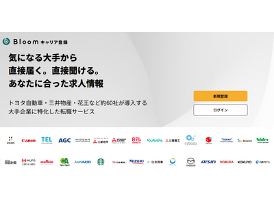 「Bloomキャリア登録」は、大手企業に特化した転職・キャリア採用プロダクトです。転職検討者は気になる大手企業を選択してキャリア情報を登録でき、経験に合った募集ポジションの案内を企業から直接受け取ることができます。2026年2月時点で67社に導入されており、トヨタ自動車、三井物産、住友商事、サントリーホールディングス、花王、KDDI、楽天グループ、NTTドコモ、野村證券、三菱地所、三井不動産など、多くの企業で活用が進んでいます。