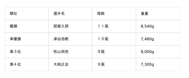 決勝戦は前回大会3位の那賀選手と名手を倒し勢いのある津谷選手の対戦。舞台は米水津を代表する名礁のひとつ横島3番。潮目やヨレなど変化のある際や沖目を丁寧に探り、前半から次々と竿が曲がる激しい釣り合いとなった。後半戦、一時は尾数で並んだものの、那賀選手が優位に試合を進め1尾リードの状況でタイムアップ。検量の結果、重量でも上回った那賀選手の優勝が決まった。日頃から支えてくれる家族や仲間への感謝の思い、念願の全国制覇に感極まった那賀選手の目には熱い涙が溢れ、頂点を決めるにふさわしい激戦は感動のフィナーレを迎えた。