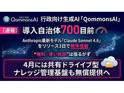 自治体行政のAXを推進するPolimill株式会社(本社:東京都港区/代表取締役:伊藤あやめ・谷口野乃花)は、行政向け生成AI「QommonsAI(コモンズAI)」に、Anthropic社の最新モデル「Claude Sonnet 4.6」を2月27日付で標準搭載したことをお知らせします。あわせて、2026年4月1日より、自治体の内部文書を即座にRAG(検索拡張生成)として活用できる「プライベートナレッジ」に、共有ドライブ型の高度なナレッジ管理基盤を追加し、全参加団体へ無料で提供することを発表します。
