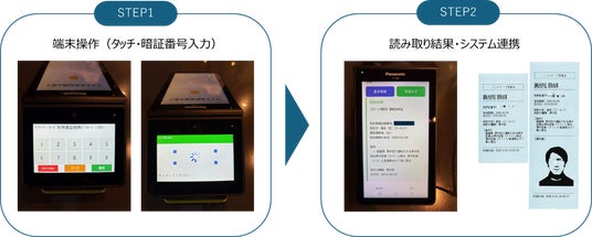 します。「マイナ免許証を端末にタッチする」「暗証番号(4桁)を入力する」の2ステップのみで完了し、繁忙期の行列解消や顧客体験の向上に貢献します。