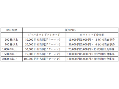 ※優待は、「ジャパネットギフトカード(電子クーポン)」または「ホリイフード食事券」のいずれかです。