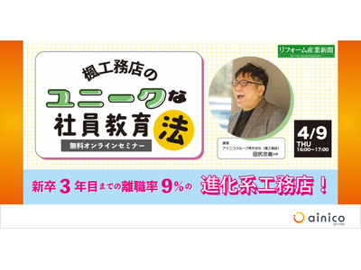 アイニコグループ株式会社(代表者:田尻 忠義、所在地:奈良県奈良市、以下、当社)が展開する住宅事業ブランド「楓工務店」は、2026年4月9日(木)、株式会社リフォーム産業新聞社主催の無料オンラインセミナーに登壇し、建築業界における重要課題である「人材育成・定着」をテーマに、当社独自の社員教育・人材育成ノウハウを公開することをお知らせいたします。