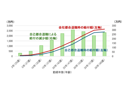 <勤続年数別における退職事由による給付の差(大学卒、事務・技術労働者、総合職相当)>