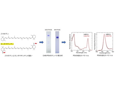 静岡大学の長尾遼准教授の研究グループは、β-カロテンをカンタキサンチンへ変換するcrtW遺伝子を過剰発現させたシアノバクテリア株からPSIを精製し、そのタンパク質構成、色素組成、および分光学的特性を詳細に解析しました(図)。