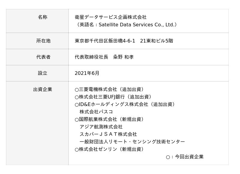 三菱電機株式会社(本社:東京都千代田区、執行役社長:漆間 啓、以下:三菱電機)、株式会社三菱UFJ銀行(本社:東京都千代田区、取締役頭取執行役員:半沢 淳一、以下:三菱UFJ銀行)、ID&Eホールディングス株式会社(本社:東京都千代田区、代表取締役社長:新屋 浩明、以下:ID&Eホールディングス)、国際航業株式会社(本社:東京都新宿区、代表取締役 社長執行役員:藤原 協、以下:国際航業)、株式会社ゼンリン(本社:福岡県北九州市、代表取締役社長:竹川 道郎、以下:ゼンリン)の5社は、2月27日に衛星データサービス企画株式会社(本社:東京都千代田区、代表取締役社長:粂野 和孝、以下:SDS)へ出資しました※1。それに伴い、SDSは事業会社化し、「衛星データサービス株式会社」として、4月から始動予定です。