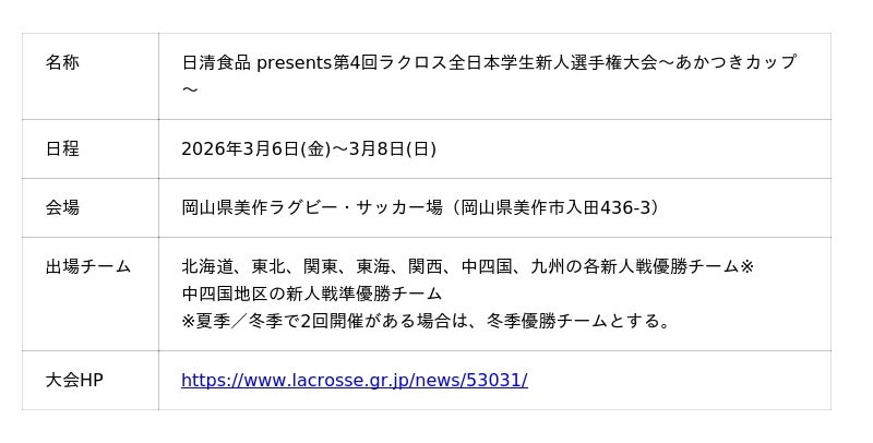 総合建設機械レンタルの株式会社アクティオ(本社:東京都中央区日本橋、代表取締役社長兼COO:小沼直人、以下アクティオ)は、2026年3月6日(金)~3月8日(日)に岡山県美作ラグビー・サッカー場で開催される「日清食品 presents 第4回ラクロス全日本学生新人選手権大会~あかつきカップ~」のオフィシャルパートナーとして今大会を応援します。