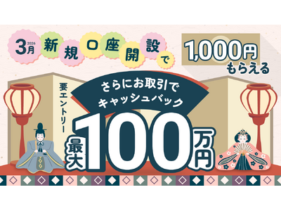 3月に新しく口座開設いただいたお客さまを対象に、2026年4月10日(金)16時00分までにキャンペーンエントリーからお申込みでもれなく1,000円をキャッシュバック、さらに期間中のお取引数量に応じて、最大100万円をキャッシュバックいたします。
