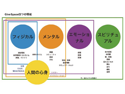 井口さんのアートは、絵や音楽など鑑賞する対象ではなく、人を巻き込み、働き方、暮らし方、考え方、感じ方を変容させていくプロセスを実験することです。具体的には、「Give Space アーバンデザイン方法論(Give Space)」を進めています。それは「生態系を先生」とし、人間の土地利用、開発の仕方を刷新、他のいきものに生息地を還すことを目的としています。このためには、建物やインフラなど物理的側面だけ扱うのでは足りません。技術的解決法はあるのに、それを選択し予算を割いて実行しない理由は、経済指標や評価軸、それに影響される組織行動や文化といった人間のシステムが阻んでいるからです。そして、そのシステムは、人間の内面的な在り方に依存します。Give Spaceとは、スペースを、1.フィジカル、2.メンタル(経済、法律、組織、文化)、3.エモーショナル(感情、情動、感性)、4.スピリチュアル(心、魂)に分け、日々の行動の中で全方向に働きかけるプロセスのことです。
