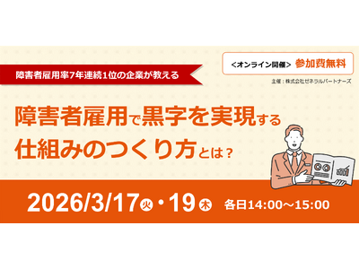 障害者の就労支援を展開する株式会社ゼネラルパートナーズ(本社:東京都千代田区、代表取締役社長:進藤均)は、2026年3月17日(火)・19日(木)に「障害者雇用の黒字化」をテーマとしたオンラインセミナーを開催します。