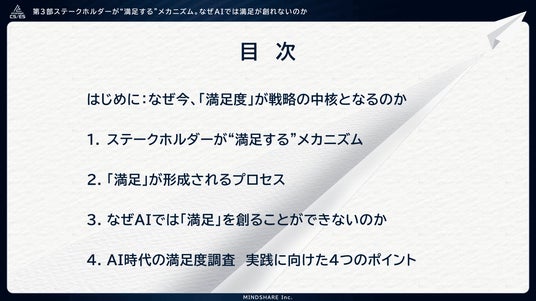 ホワイトペーパー『満足度が売上を創る』第3部─ステークホルダーが“満足する”メカニズム。なぜAIでは満足が創れないのかの主なテーマ(上記)と主な内容(下記)