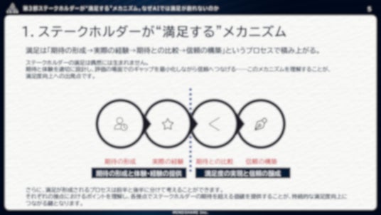 「戦略起点の満足度調査(=戦略的満足度調査)」を設計していくにあたり、そもそもステークホルダーの“満足” はどのように生まれ、育っていくのか。また、なぜAIでは“満足”を創ることができないのかを解説いたします。