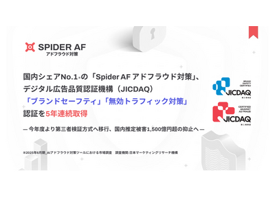 株式会社Spider Labs(本社:東京都港区、代表取締役:大月 聡子、以下「Spider Labs」)は、国内シェアNo.1のアドフラウド対策ツール「Spider AF アドフラウド対策」において、一般社団法人デジタル広告品質認証機構(JICDAQ)が定める「ブランドセーフティ」および「無効トラフィック(IVT)対策」認証を2022年の初回取得以来、5年連続で更新いたしました。