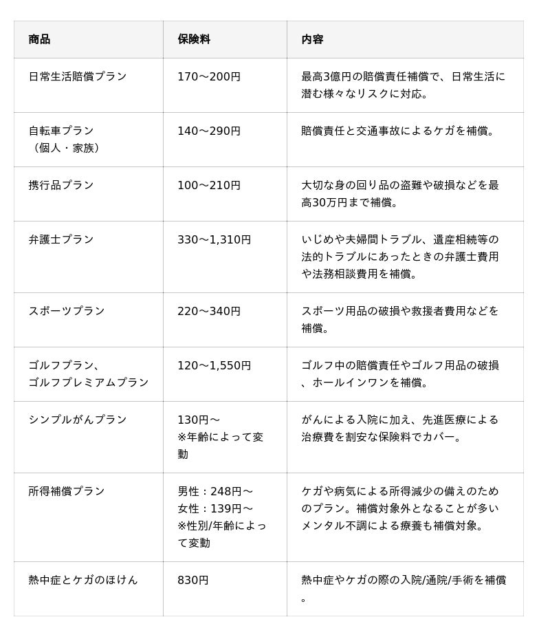 会員様の日常生活に寄り添った9種類の商品ラインナップです。様々なリスクに対し、お手頃な保険料で充実した補償が受けられます。今後も拡充を予定しております。