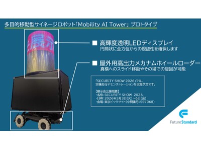 映像解析AIソリューションを提供する株式会社フューチャースタンダード(本社:東京都台東区、代表取締役:岡 寛)は、2026年3月3日から東京ビッグサイトで開催される「SECURITY SHOW 2026」において、工事現場の安全確保や商業施設・イベント会場での情報発信、省人化を実現する、多目的移動型サイネージロボット「Mobility AI Tower(モビリティ・エーアイ・タワー)」のプロトタイプを初公開いたします。