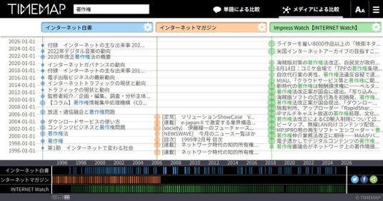 検索には時系列検索エンジン「TIMEMAP」を採用しており、キーワード検索をすると、29号分のインターネット白書の記事およびインターネットマガジンのバックナンバー記事、さらに、同じく30周年を迎えたINTERNET Watchなど、インプレスが発信してきたインターネットに関する記事が年表形式で表示されます。